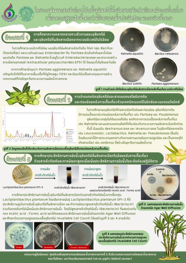 • กิจกรรมที่ 3: การศึกษาการยับยั้งเชื้อจุลินทรีย์ที่ผลิตสารเมือกที่เป็นสาเหตุหลักในการสูญเสียน้ำตาลด้วยวิธีการทางชีวภาพ (biocontrol) และพัฒนาสูตรชีวภัณฑ์และทดสอบในห้องปฏิบัติการ ได้ผลสำเร็จเบื้องต้น สามารถยับยั้งจุลินทรีย์ที่ผลิตสารเมือกได้อย่างมีประสิทธิภาพ